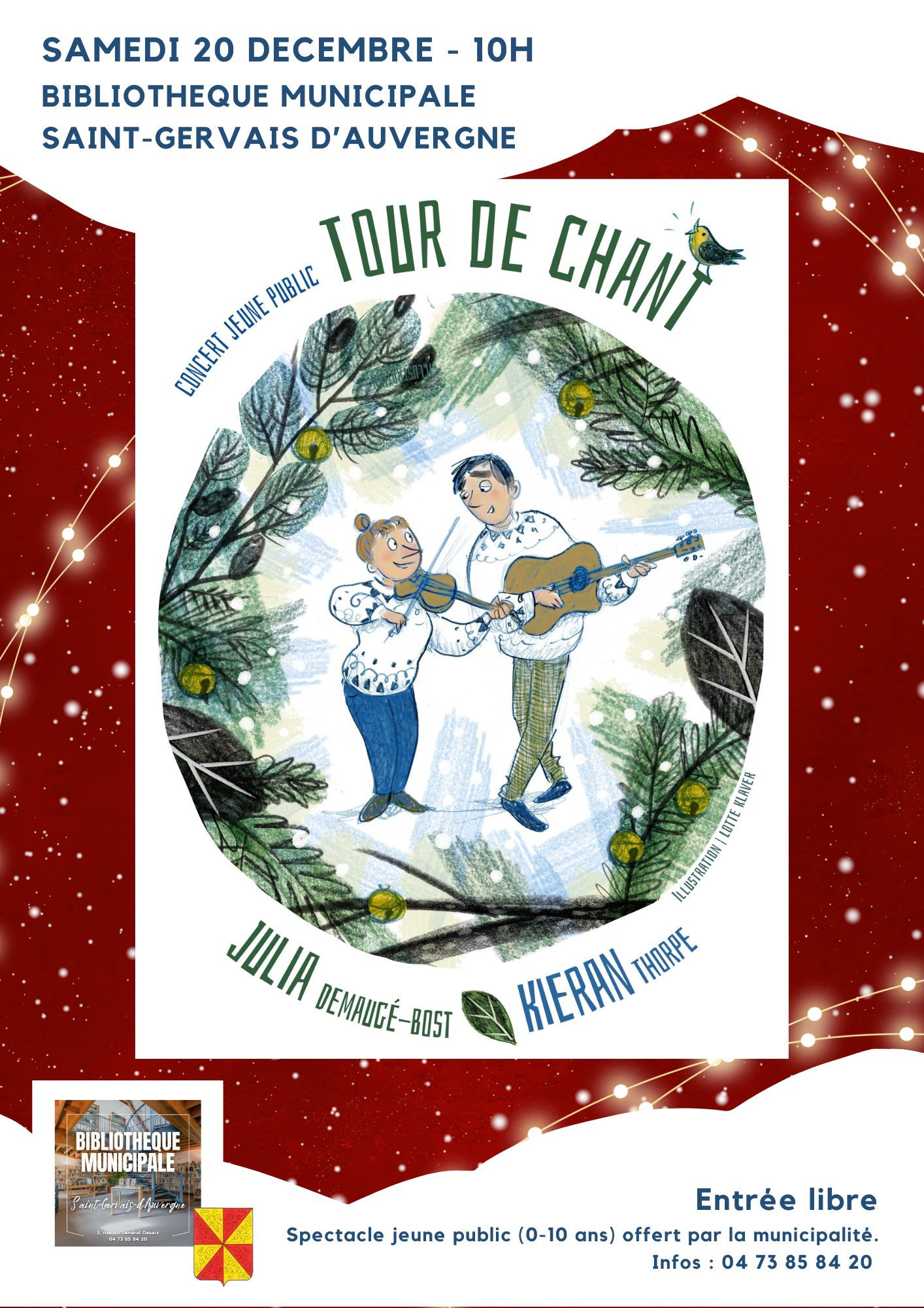 Le spectacle « Tour de chant » destiné aux enfants de 0 à 10 ans et offert par la municipalité de Saint-Gervais vous attend SAMEDI 20 DÉCEMBRE à 10h à la Bibliothèque. (3, rue Desaix)