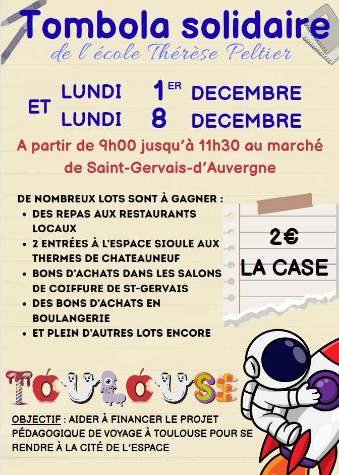 Pour financer leur voyage à Toulouse, les élèves du CP au CM2 de l’école Thérèse PELTIER de Saint-Gervais-d’Auvergne vous donnent rendez-vous au marché le 1er et le 8 décembre pour participer à leur grande tombola!